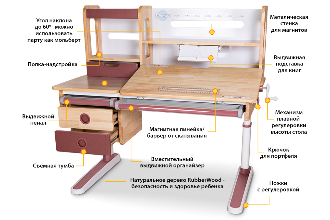 Уникальная новинка и прекрасное дополнение к столу – сьемная тумбочка из натурального дерева. Создана из экологически чистых и безопасных материалов и покрытая краской на водной основе. Эта тумба может использоваться не только, как часть стола, а и как отдельный аксессуар. Благодаря мягкой подушке и колесикам для плавного перемещения, родители могут использовать такую тумбочку, как дополнительное место во время совместного выполнения домашнего задания.