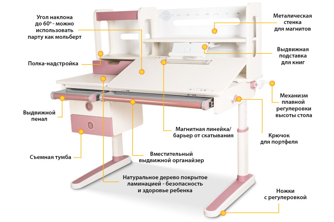 Детский стол Mealux Oxford Max – полная комплектация парты Oxford Столешница создана из древесины лиственных пород, покрыта защитной ламинацией, что позволит такому столу надолго сохранить свой вид и функциональность. Многофункциональность, прочность, современный дизайн и натуральные, безопасные материалы, качественный пластик – все это очень важно и гарантирует надежность в пользовании на многие годы.